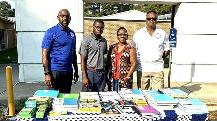 Phi Beta Sigma Fraternity Inc. donates supplies to Southwood Elementary School. Participants at the presentation were Oscar Bullard, left, a member of Phi Beta Sigma Fraternity; David Sims, assistant principal; Paula Watson, principal; and Thomas Gathen, a member of Phi Beta Sigma. The Gamma Psi Sigma Chapter of Phi Beta Sigma donated more than $500 worth of school supplies to Southwood school of the Pine Bluff School District on Sept. 19 as part of their adopt-a-school initiative. The fraternity will be doing other things for the students and staff throughout the school year as part of this initiative, according to a news release.